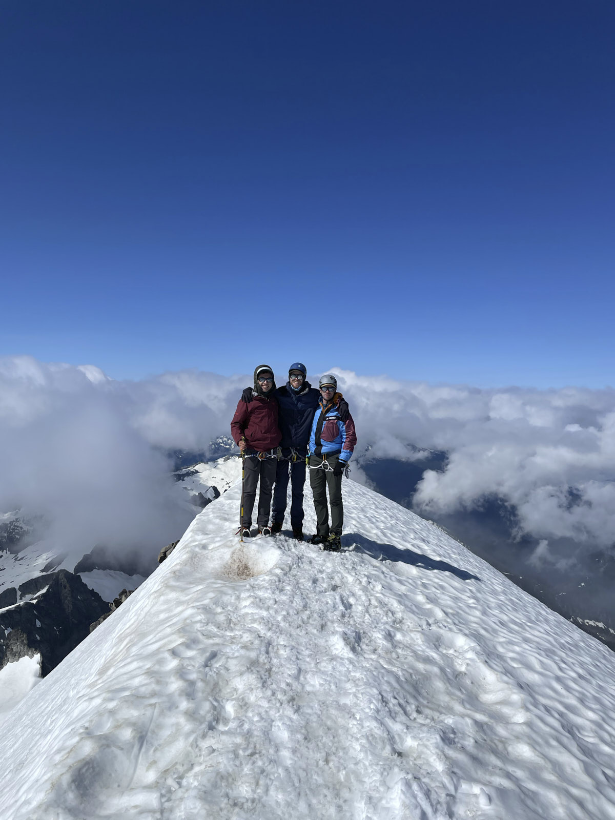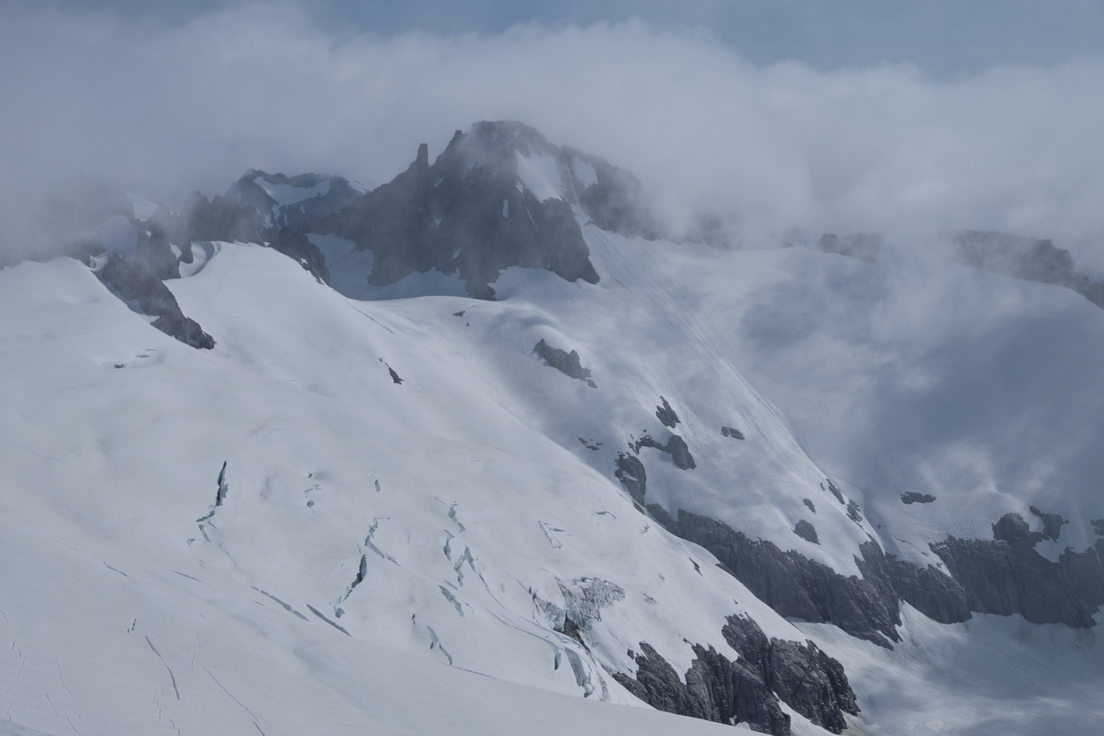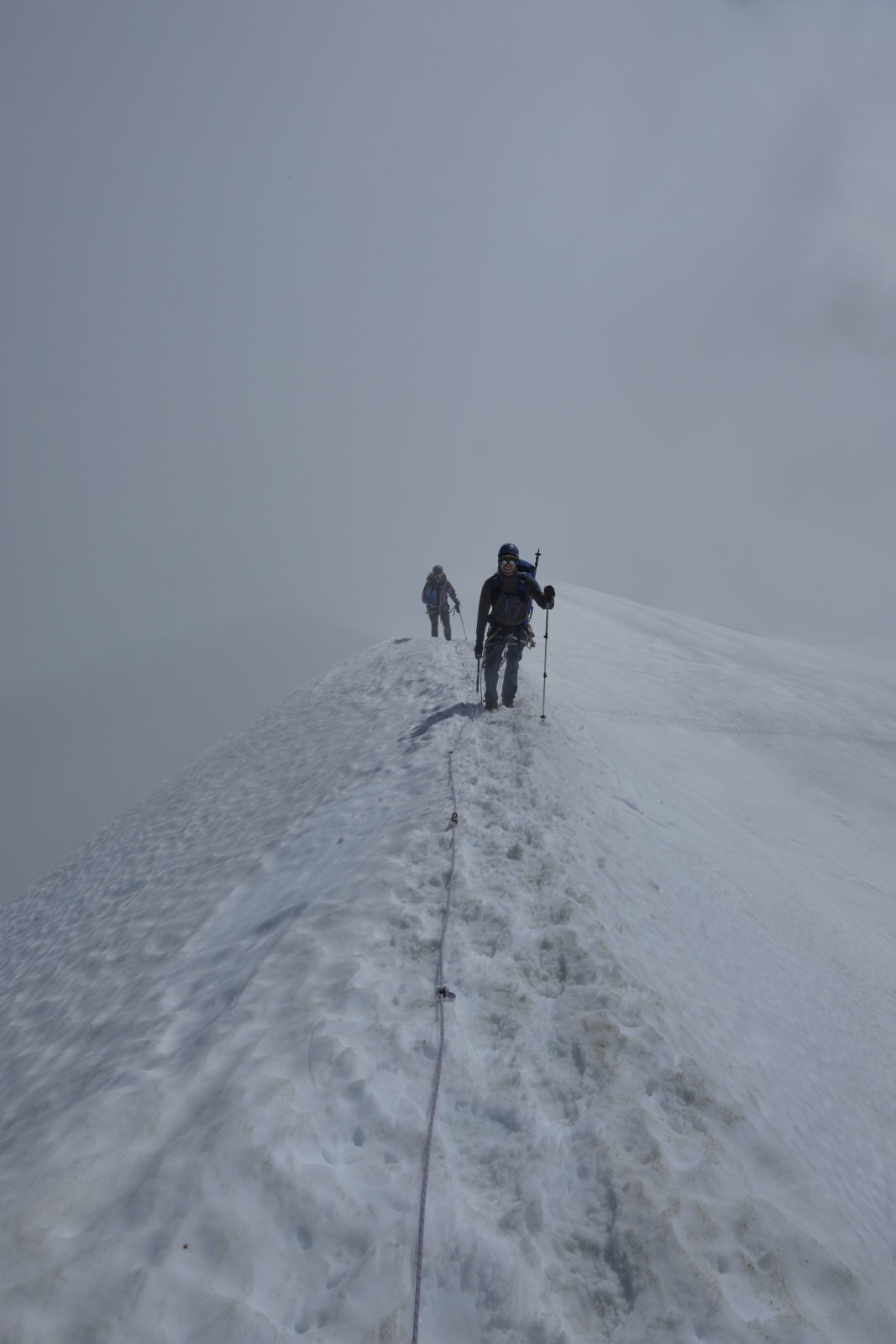 We easily steered clear of some gaping crevasses on the east ridge and made our way up to the famous “knife edge” summit ridge. Under the current conditions the knife was decidedly blunt, though, and shortly we were celebrating on the summit! Clouds came and went and we stayed a while to wait for good views in each direction before descending. We got our best views of Forbidden on the descent, although its signature summit horn never left the clouds.