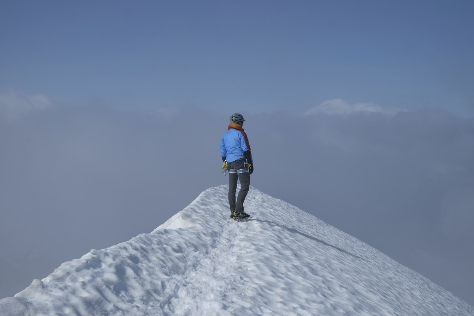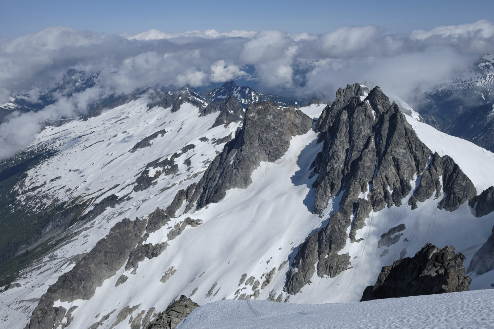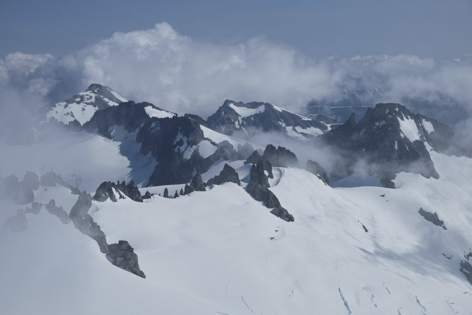We easily steered clear of some gaping crevasses on the east ridge and made our way up to the famous “knife edge” summit ridge. Under the current conditions the knife was decidedly blunt, though, and shortly we were celebrating on the summit! Clouds came and went and we stayed a while to wait for good views in each direction before descending. We got our best views of Forbidden on the descent, although its signature summit horn never left the clouds.