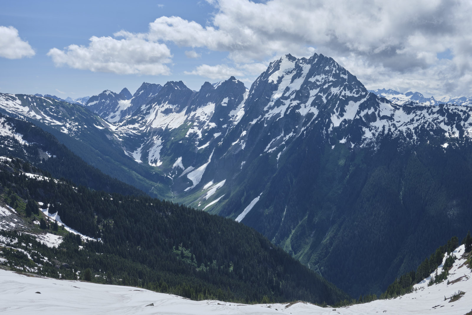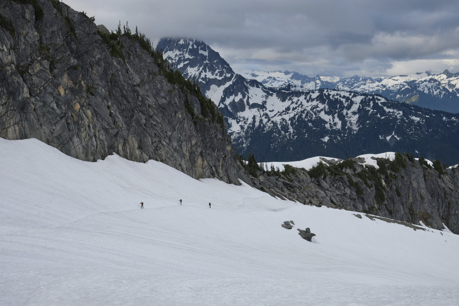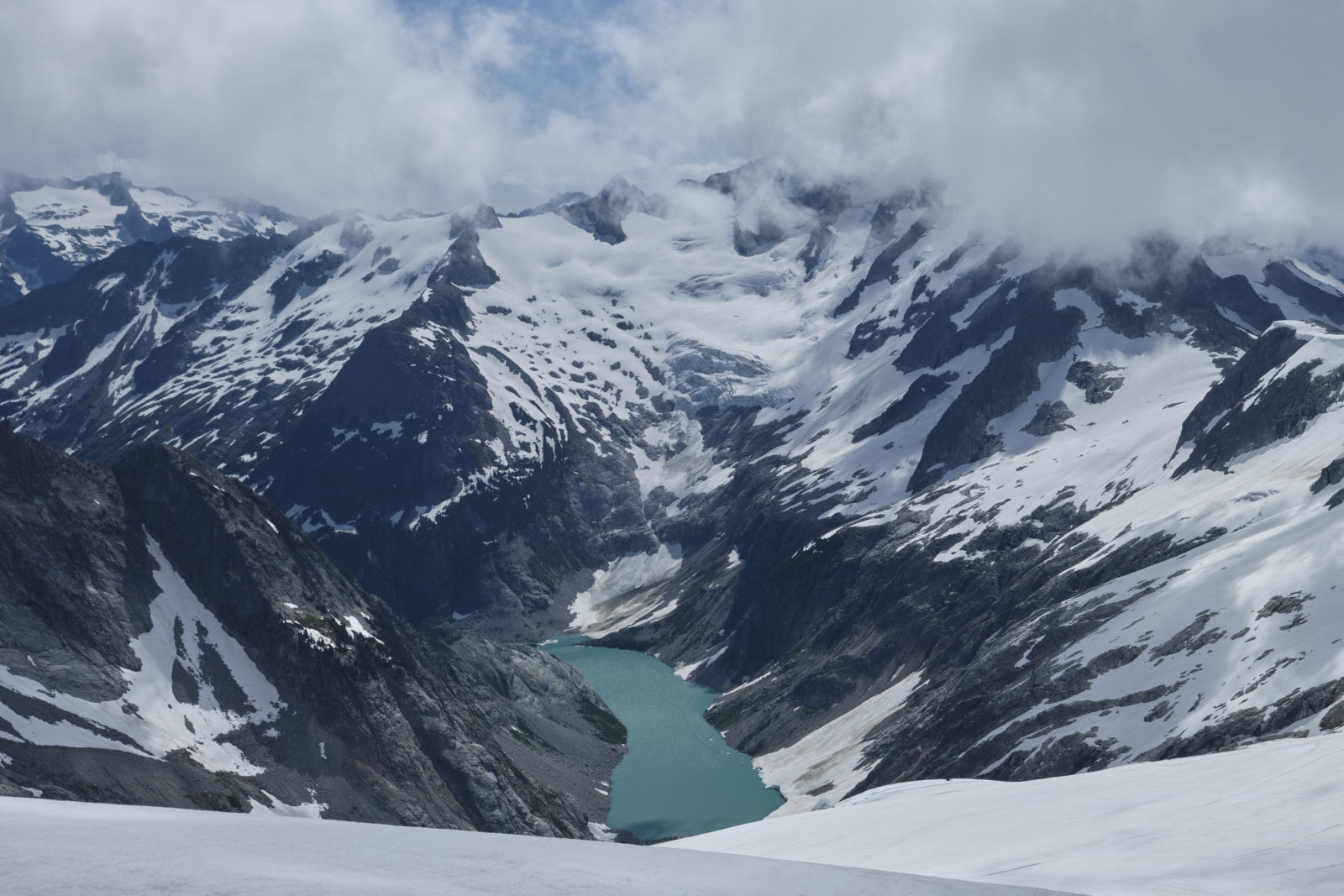 Things were much smoother sailing above the boulder field, again with a nice climbers’ trail to follow most of the time. Soon enough we hit consistent snow and it was time to change into mountaineering boots. Views were opening up over the North Fork Cascade River Valley, and Johannesburg Mountain with its hanging glaciers was looking awesome as usual.