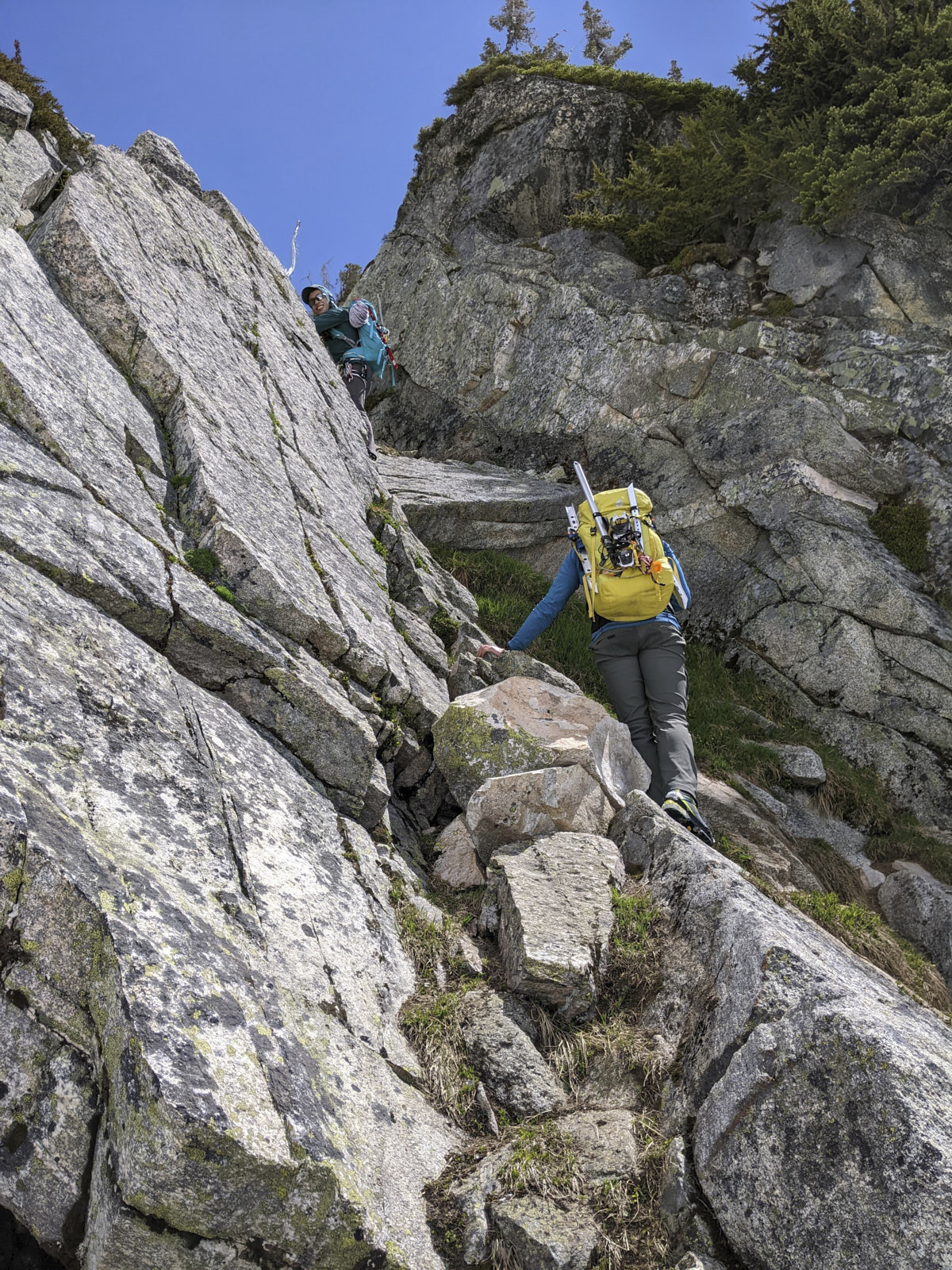 The next tricky part of the route was crossing a north-south ridge separating our drainage from the one leading to the summit. There were two reasonable gullies to scramble down the other side. We chose to go down the south one since it wasn’t as steep. It worked, but was more slabby than I liked; on the return trip we scrambled up the north gully which is steeper but ledgier. I think the north gully was better.