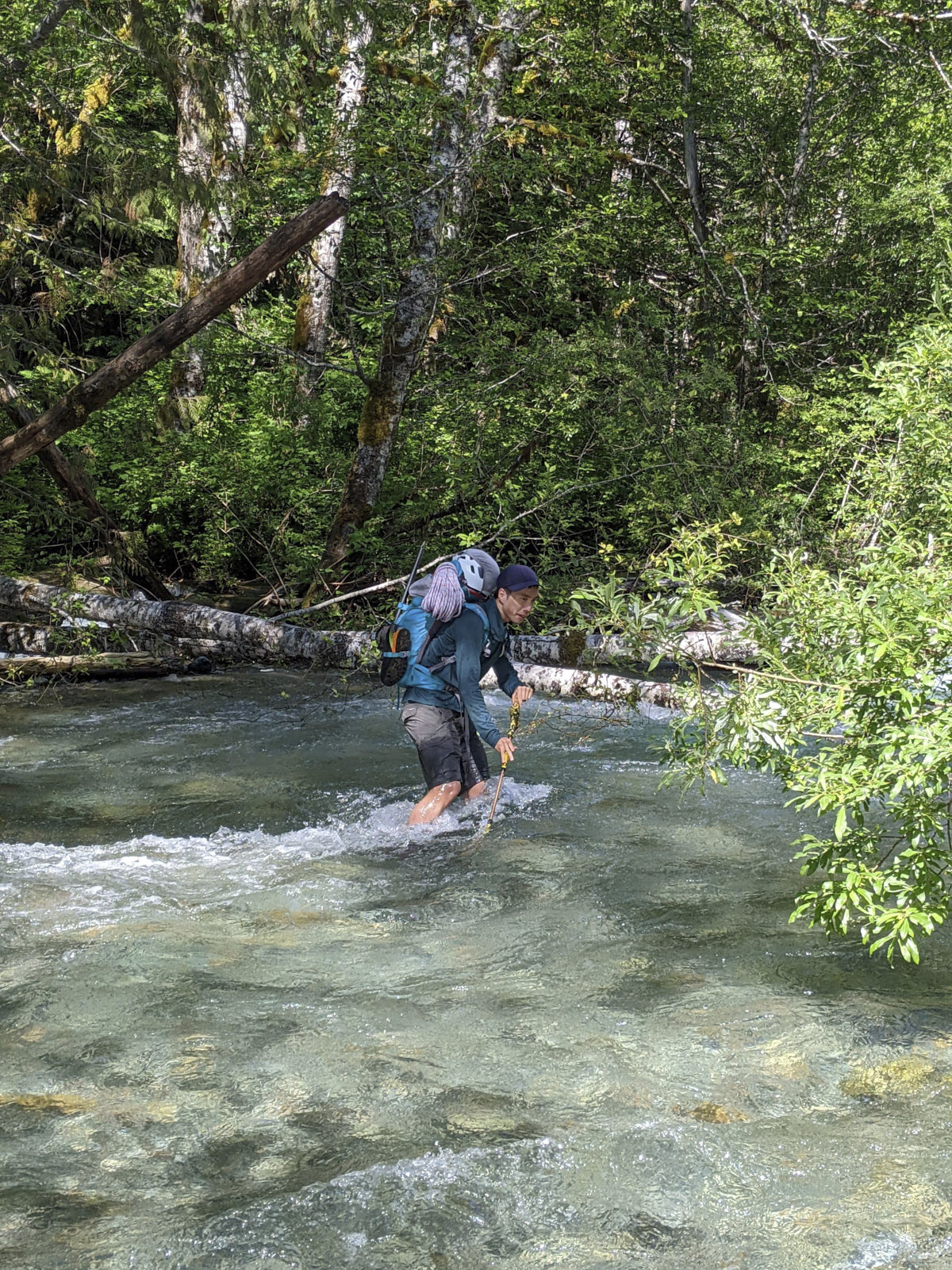 Logan, Corey, and I drove to the Eldorado lot on Friday night ahead of a Saturday alpine start. This route is interesting in that the crux is likely the river crossing just a few dozen yards from the car. There’s no permanent bridge here and climbers either need to find a log crossing or wade across. We spent some time on Friday scouting the area but couldn’t find a trustworthy log crossing, so we decided that we would just wade the river. I had brought an extra pair of old sneakers just for this purpose.