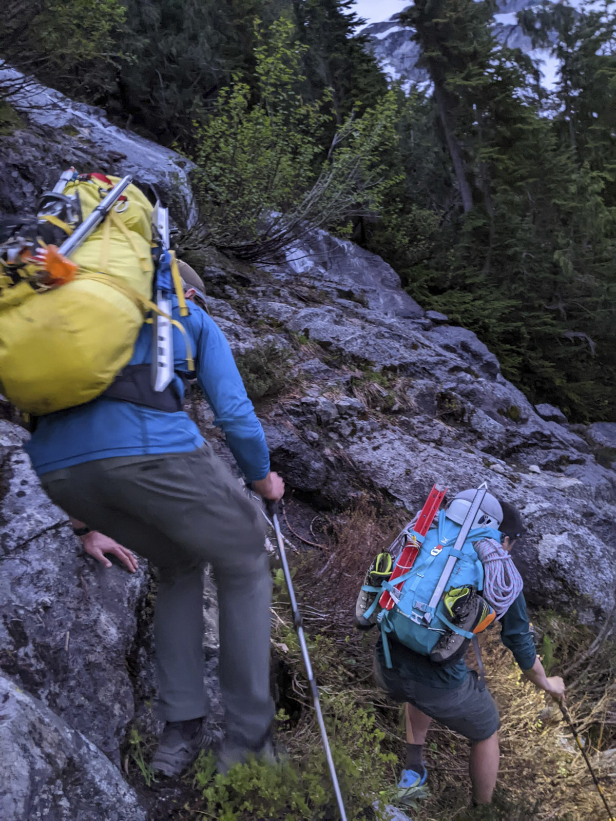 We got a 2am start the next morning knowing we were in for a long day. The river crossing went smoothly and we bushwhacked a short distance to find the climbers’ trail. It pretty well maintained for a climbers’ trail, but relentlessly steep. The forest air was exceptionally muggy this morning and all of us were sweating like crazy.