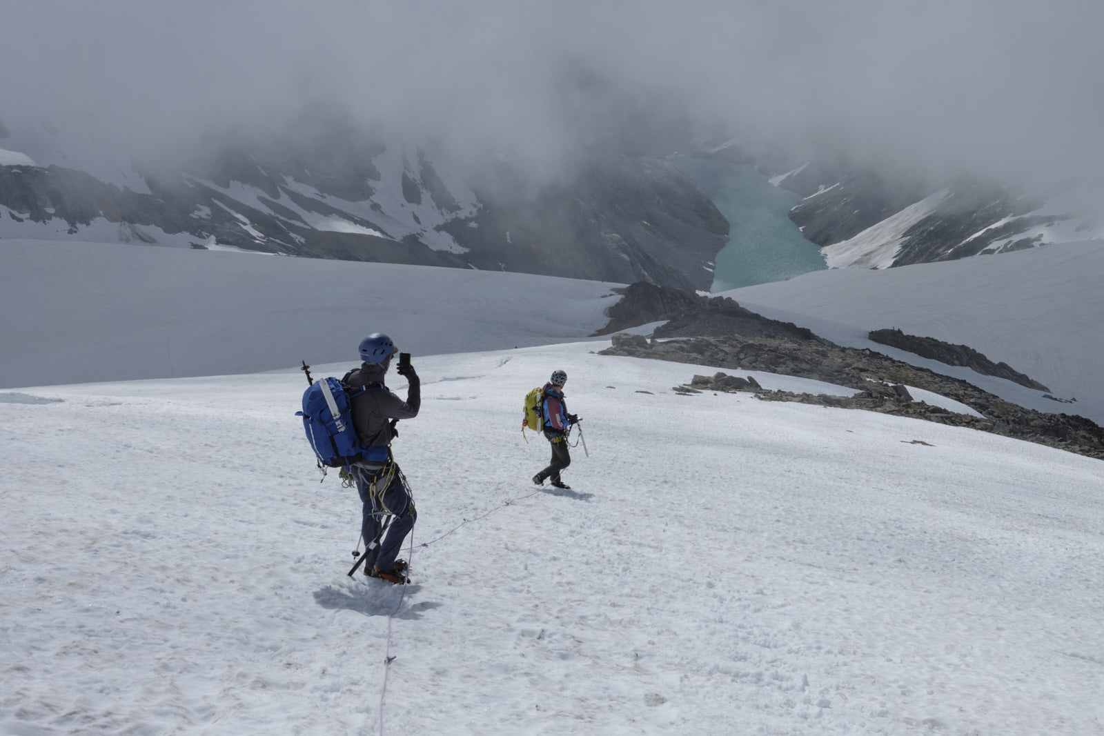 Shortly after the ridge crossing we met another group that had camped there overnight. We all roped up and started slogging up the Eldorado Glacier. We had been approaching the low cloud ceiling all morning hoping for it to go away, but we had no such luck as we marched into the clouds. Too bad! This climb is known for its unique views of the northwest aspect of Forbidden Peak and Moraine Lake and it was a shame we’d miss it.