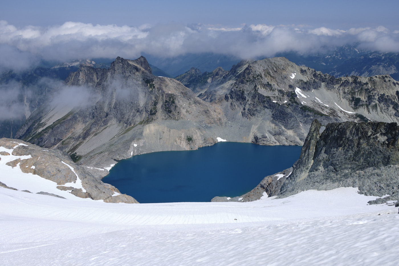 A higher view back towards Iceberg Lake, near Chimney-Overcoat col